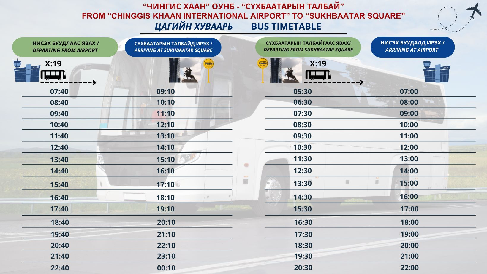 Route H-19: Sukhbaatar Square, Central Stadium, Yarmag Bus Stop 1, Buyant-Ukhaa Sports Complex, Chinggis Khaan International Airport