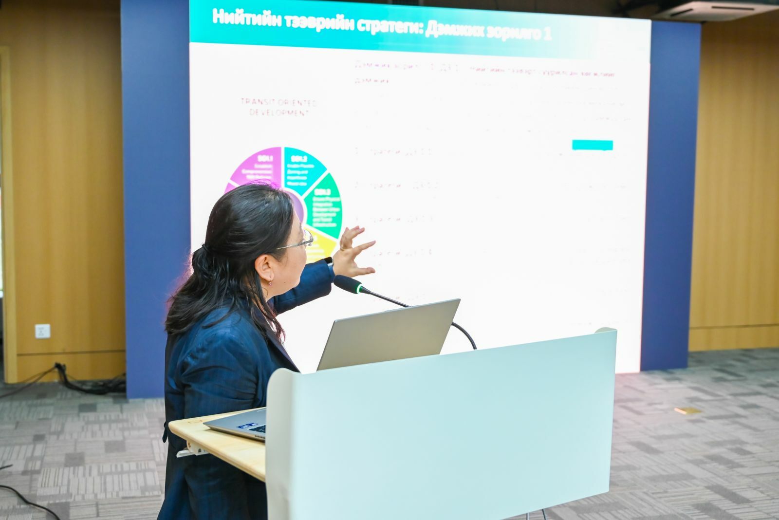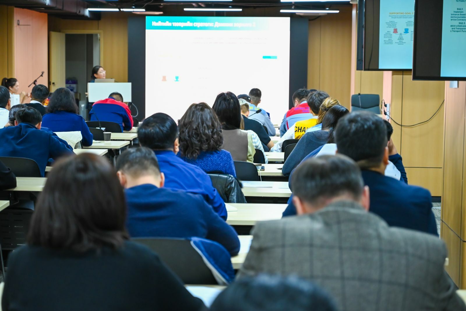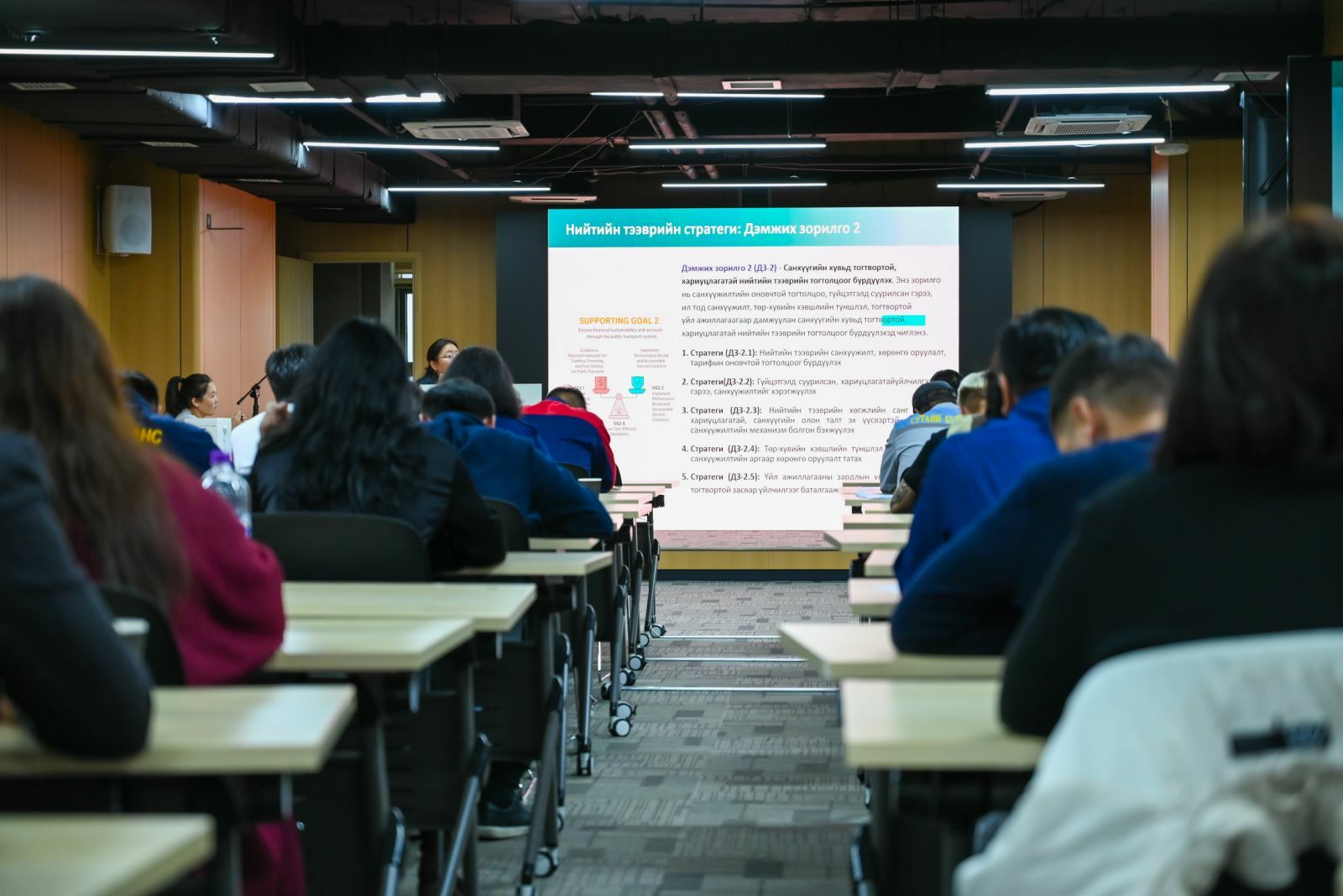 Тус ажлын хүрээнд Улаанбаатар хотын Нийтийн тээврийн стратеги болон төлөвлөгөөний төслийг боловсруулсан. Тус зөвлөх үйлчилгээний багийнхан НТБГ-ын ажилтан болон аж ахуйн нэгжийн төлөөлөлд танилцуулга хийн санал солилцож байна.