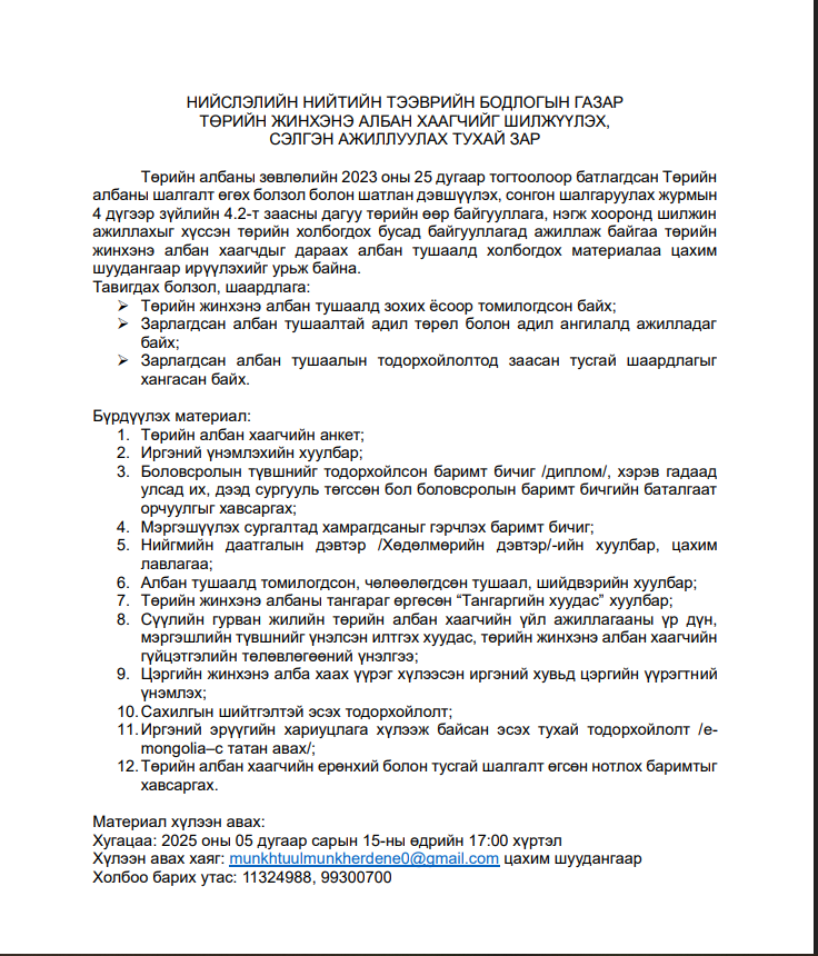 ТӨРИЙН ЖИНХЭНЭ АЛБАН ХААГЧИЙГ ШИЛЖҮҮЛЭХ, СЭЛГЭН АЖИЛЛУУЛАХ ТУХАЙ ЗАР