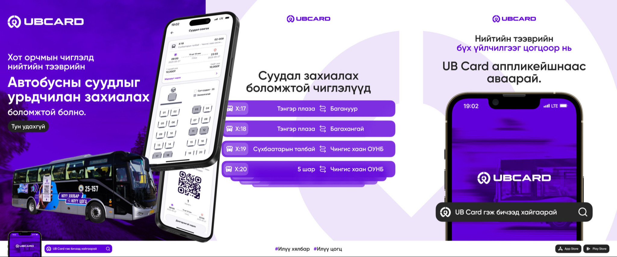 Иргэн та бүх төрлийн картаар төлбөрөө төлж зорчих боломжтойгоос гадна UBCARD аппликейшнаас дээрх чиглэлээр үйлчлүүлэх автобусны суудлаа гурван хоногийн өмнөөс урьдчилан захиалах боломжтой.